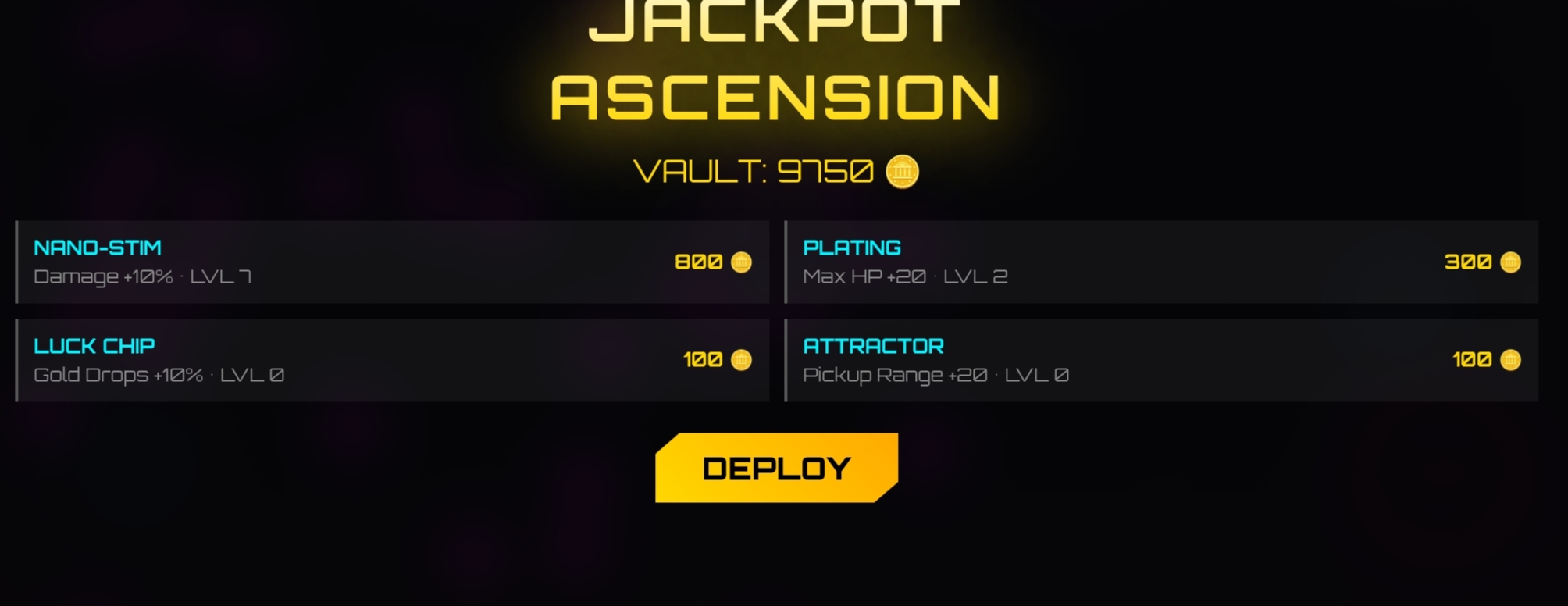 🏦 The Vault (Meta-Progression): Death is not the end. Bank your hard-earned Chips to buy permanent upgrades in the Armory. Increase your Damage, Health, and Luck to break the game in your next run.